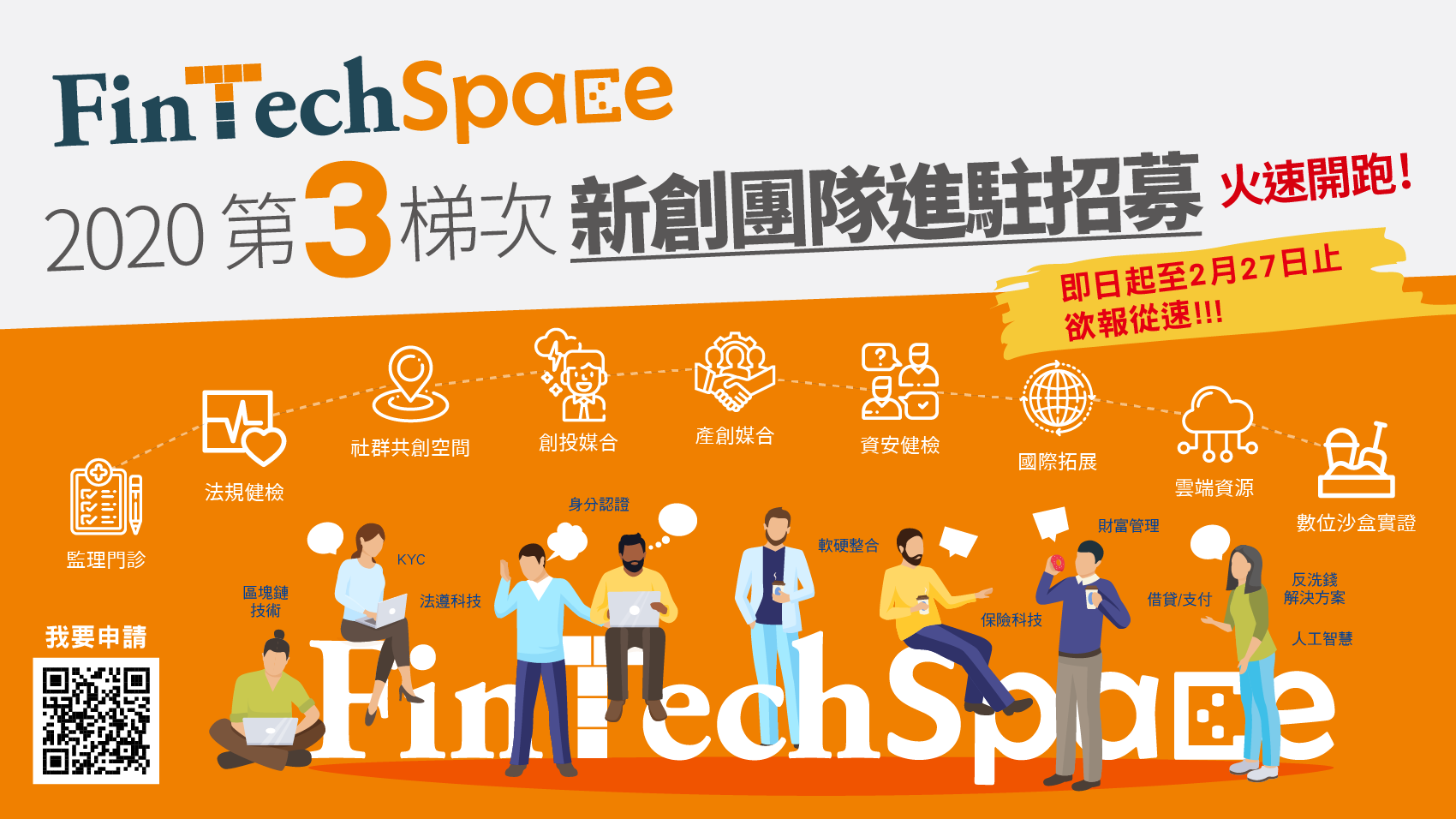 面對複雜的金融法規是否感到困難重重?在創業路上是否想要獲得更多資源呢?您絕對要參加2020年「金融科技創新園區FinTechSpace」第三梯次進駐團隊招募!FinTechSpace將提供您創新到市場最後一哩路的關鍵輔導,受理第三梯進駐申請即日起至2月27日(四)止,熱烈招募中,趕緊手刀報名喔!
