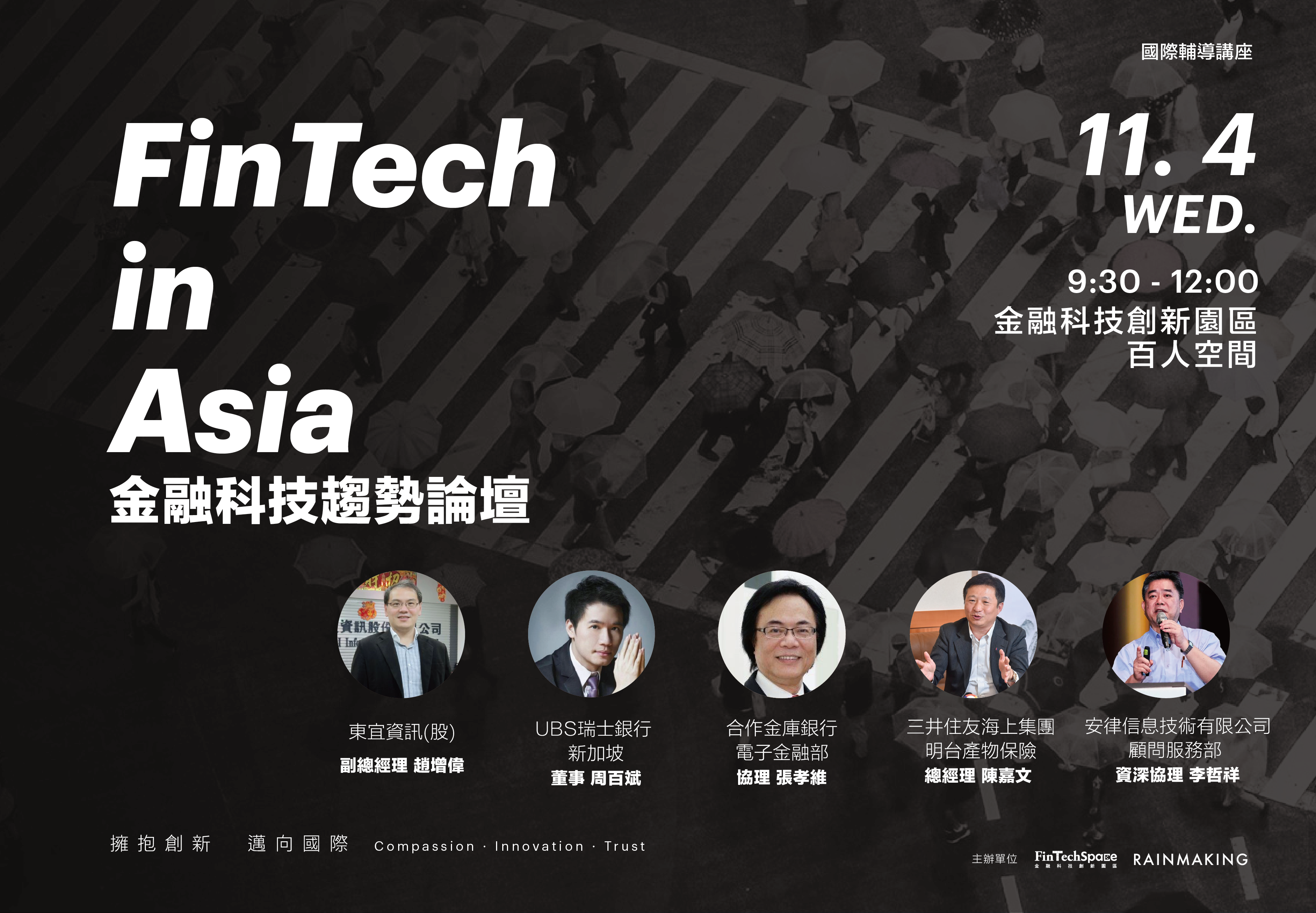 本次活動將帶領大家透過先行指標看見經濟動向,從透視老行庫的數位轉型思維出發,到了解國際保險集團持續創新動能、全球金融業面臨之數位轉型資安疑慮,並利用實際創新合作情境、面對的困境來向觀眾說明與大企業的合作模式,一步一步為新創團隊解析全球金融科技發展。